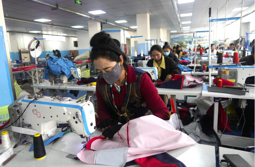 在穹鵬民族手工藝品基地,縫紉機的嗒嗒聲此起彼伏,交織出一件件精美的手工藏式服飾、校服。