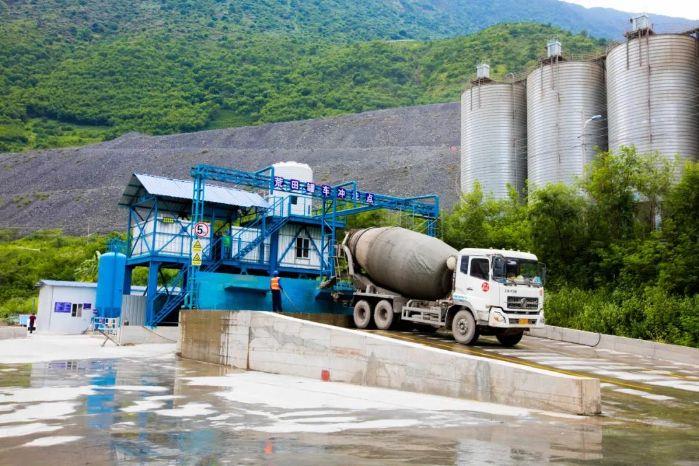 一輛滿載混凝土砂石骨料的罐車駛?cè)牍さ兀瑢⑽锪蟽A倒入工作倉面后,趕往混凝土罐車沖洗點“洗澡”——清理罐車內(nèi)部,防止砂石渣料殘留,影響骨料配比。