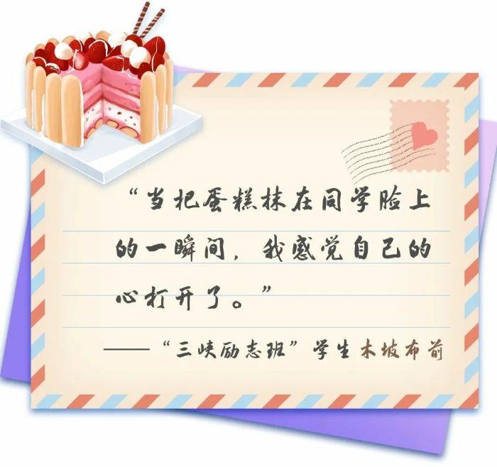 這是木坡布前十三年來過的第一個生日。“同學們都特別開心,鬧成一團,還用手指頭蘸上蛋糕上的奶油互相在臉上涂抹,” 木坡布前對那一天的場景記憶猶新,“我也被歡樂的氣氛感染了,學著同學們的樣子,我也把奶油抹到了同學臉上,那一瞬間,我感覺我和同學們的距離一下子拉近了?!钡谝淮芜^生日,第一次游學,第一次演講……木坡布前在“三峽勵志班”遇到了很多個人生“第一次”,漸漸打開了曾經封閉的心靈。課堂上,他舉手發言的次數多了起來;小組中,他參與討論的聲音也高了起來。以前,一道不會的數學題,木坡布前要花上幾個小時的時間自己想,現在他會主動尋求老師和同學的幫助,很快就弄明白了。