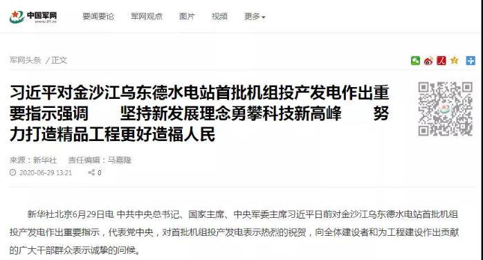 【中國軍網】習近平對金沙江烏東德水電站首批機組投產發電作出重要指示強調 堅持新發展理念 勇攀科技新高峰 努力打造精品工程更好造福人民